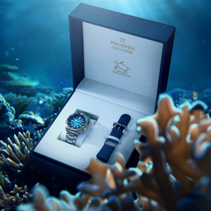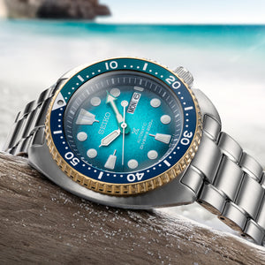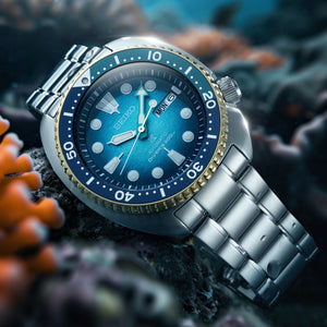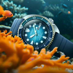 The Seiko Prospex Australasian Limited Edition ‘Kame’ SRPM04K is a remarkable celebration of nature, craftsmanship, and purpose. Inspired by the tropical paradise of Fitzroy Island and the shifting colours of the Great Barrier Reef, this timepiece captures the essence of Australia’s most treasured marine landscape. Its captivating dial mirrors the mesmerising gradient of the island’s shallow waters, where soft turquoise gives way to deep emerald and luminous blue, reflecting the changing light of the ocean throughout the day. The warm gold tones of the bezel evoke the radiant glow of a turtle’s shell basking in the sun, creating a striking contrast against the vibrant dial beneath.