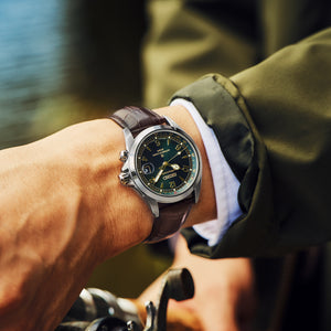 Encased in durable stainless steel, the polished and brushed surfaces catch the light beautifully, adding a subtle yet striking contrast to the rich green of the dial. The case’s compact proportions and curved lugs offer a comfortable fit on the wrist, while the exhibition case back provides a glimpse of the mechanical artistry within. The inner rotating compass ring is a nod to the Alpinist's mountaineering roots, adding both visual interest and practical function.