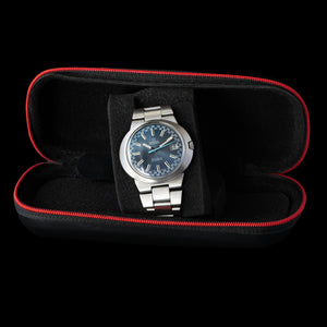 Featuring a striking blue racing dial with vibrant accents, the stainless steel case is both durable and uniquely styled, making it a true conversation starter. The sleek, curved case design provides a comfortable fit, while the eye-catching dial with its dynamic layout perfectly captures the spirit of the era.