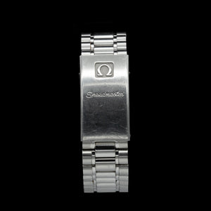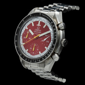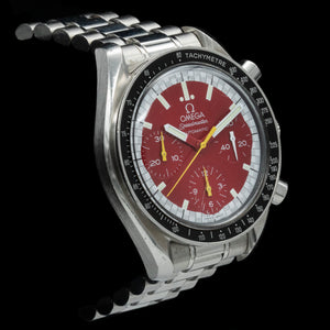 Powered by the automatic Omega Cal. 1143, the watch features a 39mm stainless steel case, tachymeter bezel, and a distinctive red dial with contrasting white sub-registers and black outer minute track. It includes a triple-register chronograph layout, date function, and is fitted to a stainless steel bracelet. These Schumacher Racing editions remain highly collectible for their distinctive colours and historical connection to Formula 1.