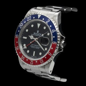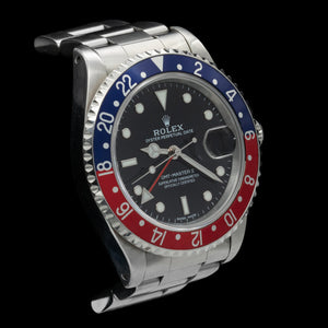 The Rolex GMT 'Pepsi' is an iconic timepiece in the world of luxury watches. The nickname 'Pepsi' comes from its distinctive red and blue bezel, which resembles the colours of the Pepsi logo.
