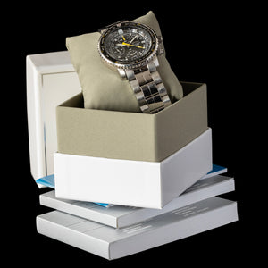 The 42mm stainless steel case features polished and brushed finishing, screw-down pushers, and a screw-down crown — offering a solid 200 meters of water resistance. The standout feature is the rotating bi-directional slide rule bezel, which allows for complex calculations like fuel consumption, speed, distance, and conversions — all without electronics.