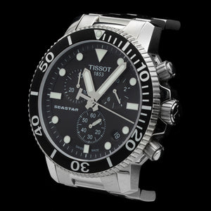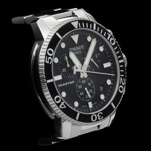 This Tissot Seastar 1000 Chronograph is a versatile and reliable watch designed for both professional divers and sports enthusiasts. It features robust construction, high water resistance, and practical chronograph functions. Its combination of sporty design and professional features also makes it an attractive option for everyday wear. The use of high-quality materials such as sapphire crystal and ceramic bezels, along with Tissot's reputable movements, ensures durability and precision.